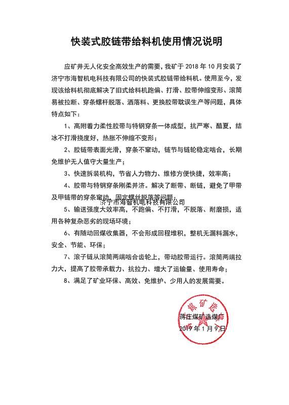 快裝式膠鏈帶給料機(jī)可實現(xiàn)完美替代物料運(yùn)輸系統(tǒng)在用的所有形式的給料機(jī),包括甲帶給料機(jī)、帶式給料機(jī)、振動給料機(jī)、往復(fù)式給料機(jī)、鏈板給料機(jī)等,膠鏈帶給料機(jī)更好的解決了跑偏、打滑、換裝困難等問題,更利于實現(xiàn)快速裝車、高效自動化的現(xiàn)代智能運(yùn)輸系統(tǒng)要求。